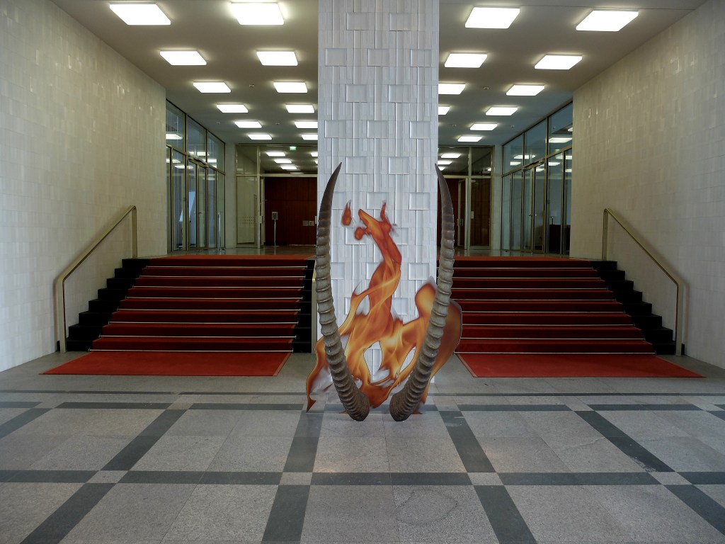Seda hoonet ja sinna paigutatud teoseid võiks vaadata tervikuna – endises Saksa DV Riiginõukogu hoones asuv majanduskool European School of Management and Technology on niivõrd selge ruumi- ja sisekujundusloogikaga, et ilmselt sinna midagi sellist intalleerida ei saakski, mis visuaalselt ei suhestuks. Pigem tekib küsimus, et kas live-börsiinfo ja kooli toetajate nimekiri (nt Gazprom) seinal on teos või mitte. Katja, tuues arhailisest kultuurist pärit trofee kaasaegsesse kapitalistlikku maailma, annab nii majandussuhetele kultusliku mõõtme – viljakust jmt sümboliseerivad loomasarved on erekteerunud börsinoole ekvivalent, mida lõpuni ei suuda omavahel lahutada ka kõik vahepealsed sajandid. DIS toob biennaali raames mitmes kohas välja majandusmudelite kummastava, kohati ebaloogilise ja arusaamatu toimemehhanismi, mis Katja töös võtab spirituaalse mõõtme.