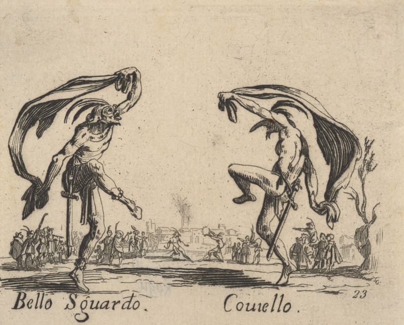 Üks väljapaistvamaid ofortiste, Lotringist pärit Jacques Callot (1592–1635) veetis noorpõlve Itaalias. Tema looming ühendab maneristliku keerukuse ehtprantsusliku vaimukuse ja selge vormiga. Eesti Kunstimuuseumi Mikkeli muuseumis on peaaegu tervenisti olemas Callot’ sari „Balli di Sfessania“ (24 lehest 23). Nendes tillukestest lehtedes ei võlu mitte ainult grotesksed tegelased ja elavad situatsioonid, vaid ka detailide kõnekus. Sari kujutab commedia dell’arte (it ’improvisatsioonikomöödia’) tegelaste rahvalikke eeskujusid. Sõna balli pealkirjas tähendab tantse; „sfessania“ on Napoli dialektis teatud liiki grotesksete tantsude nimi. Sfessania tantsudele on omane võluvate ja peente liigutuste vaheldumine jõhkratega, taltsutamatu ägedus ja koomilised kummardused. Neist aegadest on ka pärit komme tantsida paaridena, mees mehe vastu, justkui matkides linde kukevõistlustel.
