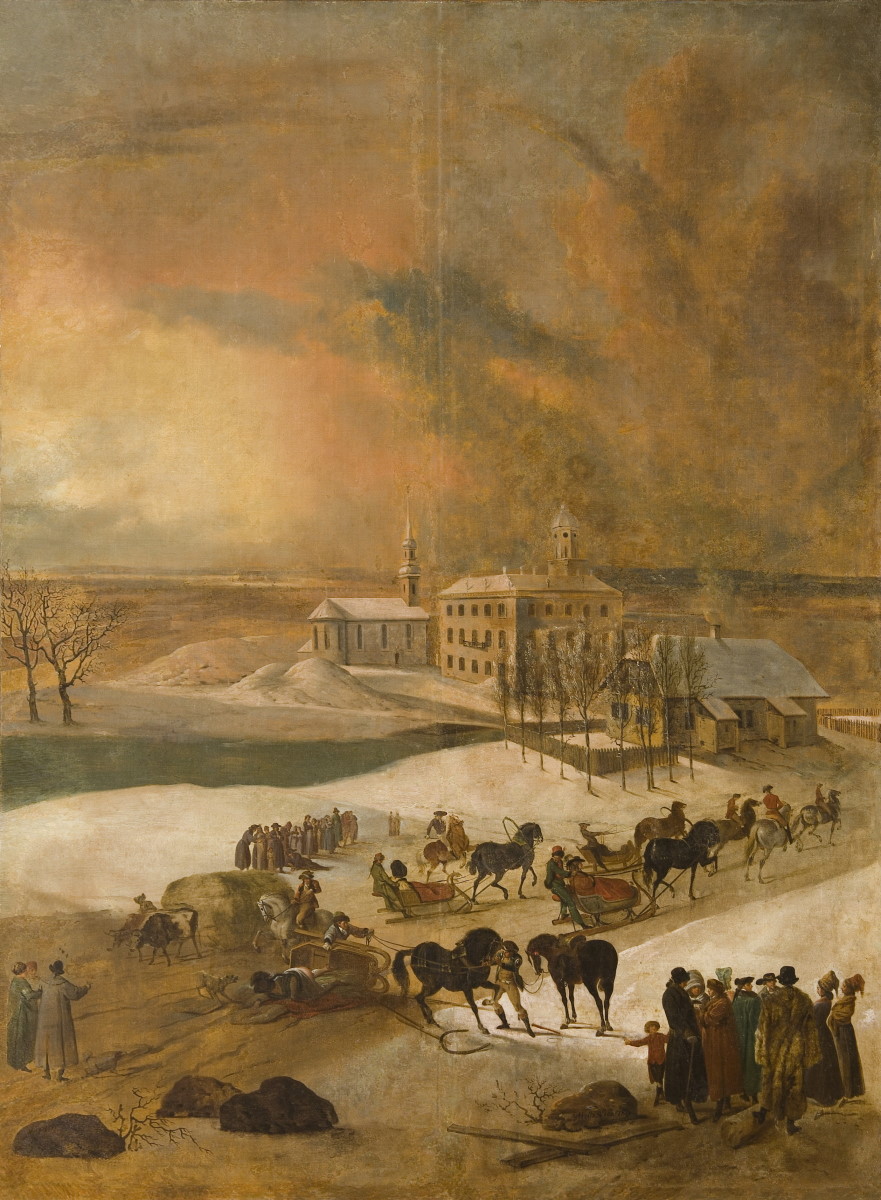 Põltsamaa lossi vaade on üks paremaid näiteid Eestis haruldasest rokokookunstist. Põltsamaa lossi uhke interjöör ehitati välja 1770. aastatel. Lossihärra von Lauw kutsus kokku maalijaid ja stukimeistreid ning käivitas Eestis ennenägematu luksustööstuse: portselani-, klaasi- ja peeglimanufaktuurid. Maal on sündinud kahe kunstniku koostöös. Gottlieb Welté saabus Põltsamaale 1781. aastal saksa rokokoo ühest keskusest Mainzist. Osava galantsete stseenide maalijana täiendas ta Kuramaa meistri Friedrich Hartmann Barisieni loodud avarat Põltsamaa vaadet inimfiguuridega. Nii näeb lumisel lossiesisel maastikul rahvasumma, kes on kogunenud vaatama saanidel kihutavat seltskonda. Poisike püüab juhtida tähelepanu sõitjatega juhtunud äpardusele: üks daamidest on ümberläinud saanist välja kukkunud ja tema seelikute alt välgub rokokooliku frivoolsusega paljas ihu. Põltsamaa loss põles Teise maailmasõja ajal ja sellest on alles ainult varemed.