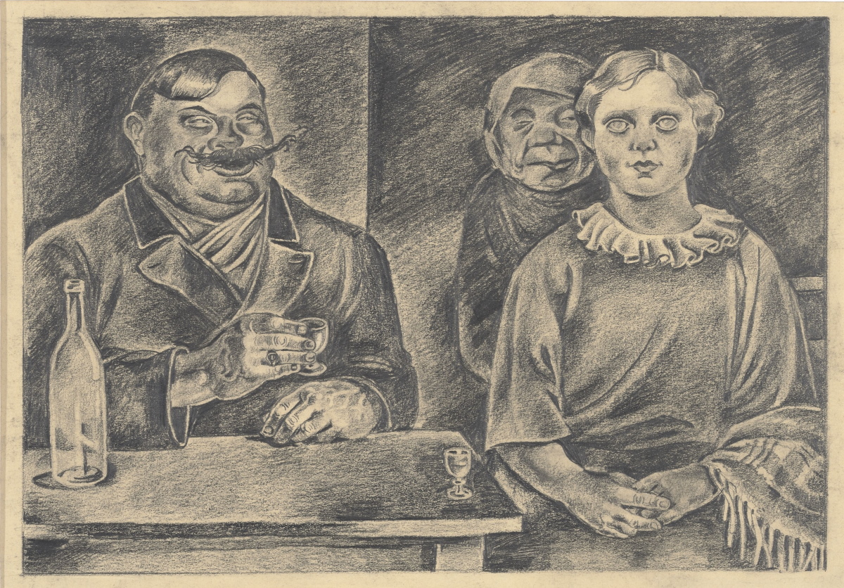 1920. aastate ühiskonnakriitilises kunstis paistab julguse ja teravusega silma Natalie Mei (1900–1975) pliiatsijoonistuste sari. Tegelaste eluolu on kujutatud hallides toonides. Sarja joonistustel on portreteeritavad enamasti näoga vaataja poole, mis ei lase nende traagikat ignoreerida. Rõivad, esemed ja olustik annavad aimu, et tegelased kuuluvad vaesemasse ühiskonnakihti. Inimesed on esitatud selgelt väljajoonistunud karakteritena, mis ei jäta kahtlust nende rolli või elukutse osas. Siinsel pildil viitab prostitutsioonile vana naine, kes kupeldab vaataja poole apaatse pilgu suunanud noort naist himurale kliendile. Mei oli 1920. aastatel Eestis ainuke naiskunstnik, kes käsitles prostitutsiooniteemat. Enamasti on prostituute kunstis kujutatud meeste perspektiivist, romantilise või hukkamõistva alatooniga. Mei hoidub nendest stereotüüpidest ja toob selle asemel välja naise nõrgema positsiooni ühiskonnas. Euroopas ringi reisinud kunstnikule oli eeskujuks uusasjalik kunst.
