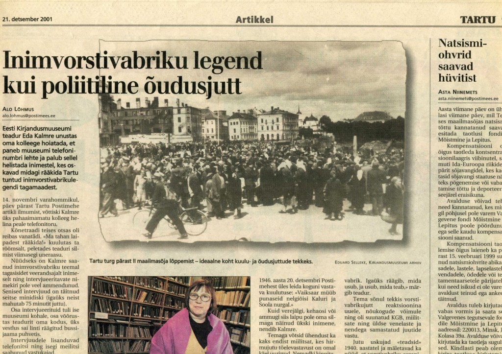 Samal päeval kell 16 toimub näitusel Eda Kalmre loeng teemal „Inimliha vorstivabrik. Uurimus Tartu sõjajärgsest kuulujutust“. 20. sajandi sõdade ajal ja järel liikusid Euroopa linnades mõjukad ja võikad kuulujutud koletislikest inimkeha vastu suunatud kuritegudest. Loengus käsitletakse ajalooliste dokumentide, fotode, suuliste intervjuude jms vahendusel Tartus sõja järel kodunenud kuulujuttu inimliha vorstivabrikust, avades selle jutu mitmeid tähendusruume omast ajast kuni tänapäevani. Esineja Eda Kalmre on vanemteadur Eesti Kirjandusmuuseumis folkloristika osakonnas. Tema uurimisteemadeks on kaasaegne rahvajutt (linnalegendid ja kuulujutud), jutustamine ning selle sotsiaalpoliitilised aspektid.