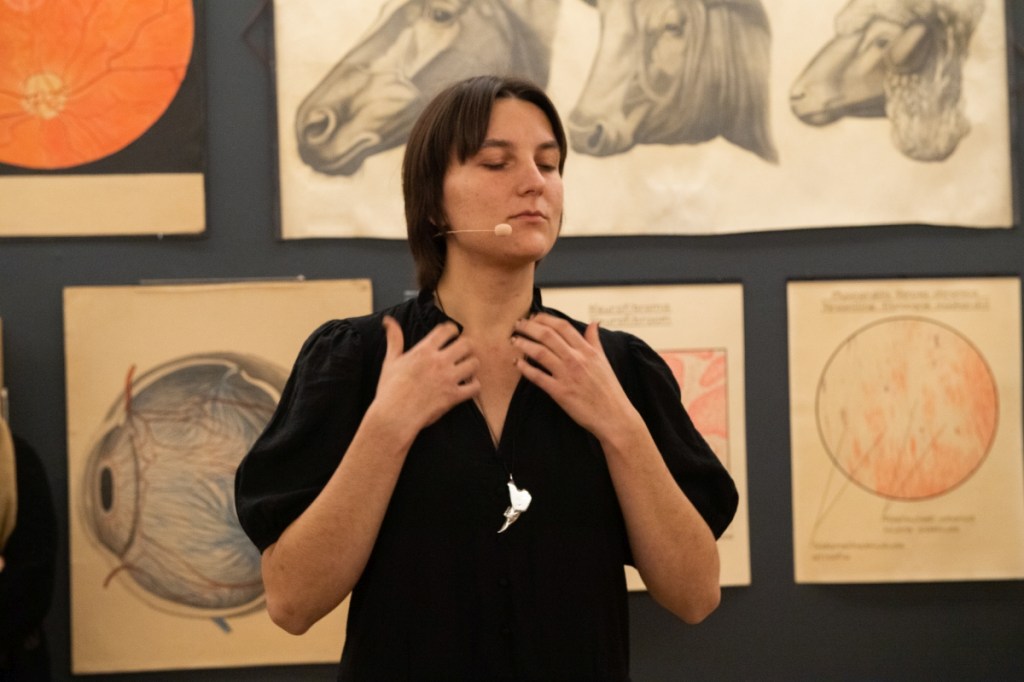 Pärast vestlust on kõigil võimalus näitusesaalis osa saada Joanna Kalmu osalus-performance’ist. Tihti tegeleme endast väljaspool olevaga ning hoiame tähelepanu välisel. Pöörates fookuse sissepoole, leiame end ühisest keharännakust: kogeme kihilist keharägastikku, mis tuksub, nõretab, võbeleb, tiheneb ja vabaneb. Keha kui anatoomiline pilt sulab ning saame osa enda sisemisest vaatemängust ning mitmekesisest elususest. Joanna Kalm on tantsukunstnik-uurija, kes tegeleb kehalisuse ja tantsu lahtimõtestamisega. Ta juhindub küsimusest: millist kehastumist loob kaasaegne keskkond ning enese keha kuulamine ja järgimine? Tema loomingus on kesksel kohal just isikliku somaatilise teovõimekuse ja väljenduslikkuse suurendamine.