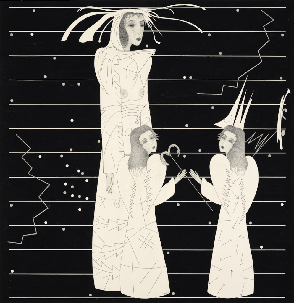 Graafiku ja graafilise kujundajana hästi tuntud Tõnis Vint (1945–2019) andis nõukogude ja taasiseseisvunud Eesti kunsti suure panuse ka kunstipedagoogi, -uurija ja -teoreetikuna. Tema pärand seostub paljuski reflekteerimisega kunsti ja laiemalt visuaalkultuuri üle, sünteesides eri ajastute kunstitraditsioone ja visuaalseid märgisüsteeme. Nõnda näeme Vindi teoses „Ööhelbed II“ (1978) dialoogi Euroopa 19. sajandi sümbolistliku maali unenäolise-mütoloogilise maailmaga, aga ka Idamaade traditsioonilise kunstiga. Just Idamaade kunstikaanoni tavast kujutada olulisi tegelasi kahe väikesekasvulise saatja sümmeetrilises raamistuses on Vint ammutanud inimese kahe kaitseingli idee. Võrreldes Lääne religioossele mõttele iseloomuliku arusaamaga, kus inimest saadab kaitseingli kõrval ka kiusav deemon, avaldub siin hoopis teistsugune, helgem ja lootusrikkam arusaam inimloomusest.