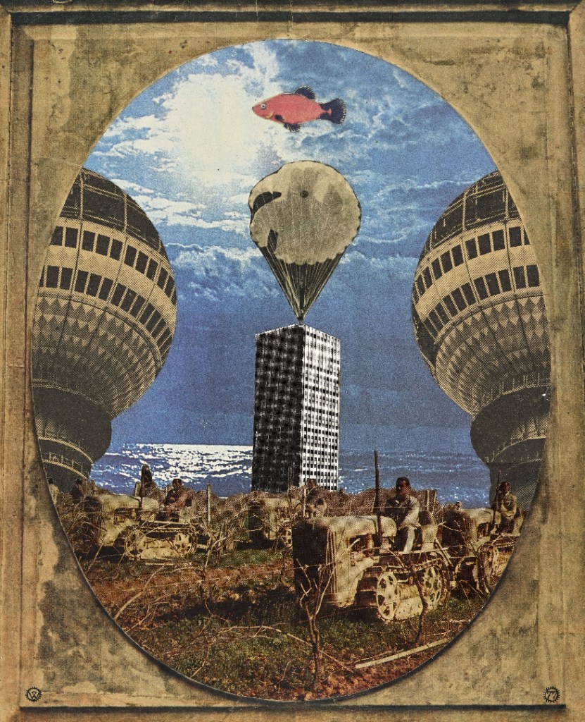 Vello Vinn on 1960. aastatel kunstiellu astunud graafik ja illustraator, kelle loomingule on iseloomulikud teravmeelsed mõistukõned. Kui tema teoste vormikeel põhineb sümmeetrial ja korrastatusel, siis tähenduse tasandil leiab neis sageli aset omavoliline nihestamine, muu hulgas kujundi- ja sõnamängude kaudu. Nõukogude tsensuuri tingimustes õnnestus Vinnal luua isikupärane visuaalne süsteem, kus huumori ja absurdi taga oli peidus ka kriitilisemaid sõnumeid. Nõnda on söövituses „Künd“ nõukogude kunstis soositud edumeelse põllutöö teemat esitatud eriskummalise spordivõistlusena, kus tulemusi mõõdetakse stopperiga, viljakoristus toimub künniga samal ajal ning teravili muundub imeväel leivaks. Kollaaž „Traktorid“ kujutab aga põllutööd lausa düstoopilises võtmes: uhkete kõrgtehnoloogiliste ehitiste kõrval mõjub üsna algeline põllumajandustehnika üllatavalt, pimestav taevas ja kidur põld loovad pigem kõrbe kui viljaka maa mulje. Kuldkalake kõrgel taevas mõjub aga kelmika triksterina ega lase teost tõlgendada puhtmoraliseerivas võtmes, vaid loob ruumi sürreaalsele mõõtmele.