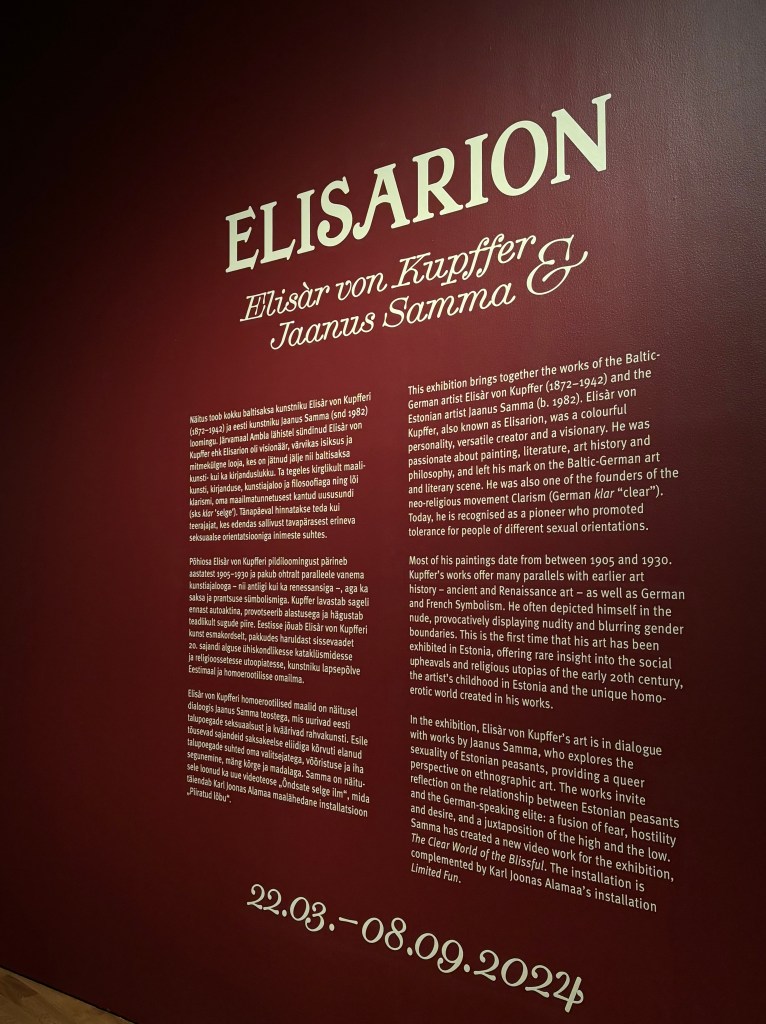 Järvamaal Ambla lähistel sündinud Elisàr von Kupffer ehk Elisarion oli visionäär, värvikas isiksus ja mitmekülgne looja. Põhiosa tema pildiloomingust pärineb aastatest 1905–1930 ja pakub ohtralt paralleele vanema kunstiajalooga – nii antiigi kui ka renessansiga –, aga ka saksa ja prantsuse sümbolismiga. Oma maalidel lavastas ta ennast sageli autoaktina, provotseeris alastusega ja hägustas teadlikult sugude piire. Ta tegeles kirglikult maalikunsti, kirjanduse, kunstiajaloo ja filosoofiaga ning lõi oma maailmatunnetusest kantud uususundi – klarismi (sks klar ‘selge’). Tänapäeval hinnatakse Kupfferit kui teerajajat, kes edendas sallivust tavapärasest erineva seksuaalse orientatsiooniga inimeste suhtes.