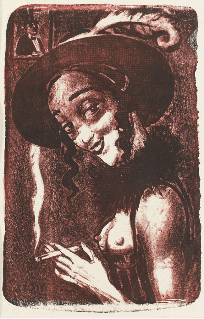 Teosel „Naine sigaretiga“ näeme üleni paljastatud rindadega „kirglist naist“ ehk „lõbutüdrukut“ kliente ligi meelitamas. Taamal juba paistabki uhke torukübaraga meesterahvas, kes peatunud tõlla aknast naist endaga kaasa kutsub. Too heidab veel viimase väljakutsuva pilgu vaataja suunas, enne kui mehega kaasa läheb. Naise pilgule lisavad sugestiivsust poolsuletud laud ja tumedaks võõbatud huultega meelas naeratus. Lai sulgkübara serv heidab tema näole varju, mis rõhutab „poolilmadaami“ hämarat staatust veelgi. Nii tegelaste riietus kui ka tõld võimendavad seksitööd romantiseerivat kujutamisviisi, viidates pigem 19. sajandi lõpule – ajale, mil Londonis tegutses kurikuulus seksitöötajaid mõrvanud Rappija Jack.