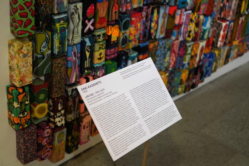 Kumu aatriumis saab vaadata nüüd Erki Kasemetsa ülemaalitud joogipakendeid hõlmavat teost „LIFE-FILE“ (1989–2024), mis on Eesti Kunstimuuseumi Kunstisõprade Seltsi kingitus muuseumile 105. sünnipäevaks. Samal seinal oli varem väljas AA Bronsoni & General Idea teos „AIDS“ (1987/2010). Seoses järgnevatel aastatel plaanitud Kumu aatriumi renoveerimistöödega otsustas muuseum kõnealuse teose asemele luua koostöös Erki Kasemetsaga uue installatsiooni. Kasemetsa kunstile on omane säästlik mõtteviis, mis lähtub peamiselt käepärastest materjalidest ja biograafilisest ainesest. Teoses „LIFE-FILE“ näeme maalingute, daatumite või tekstiga varustatud tühje joogipakke, mis tähistavad päevi kunstniku elus. Tegemist on kohaspetsiifilise installatsiooniga, mis on võtnud lähtuvalt eksponeerimisruumist oma elutee jooksul erinevaid vorme ja mahte. See on Eesti nüüdiskunstiloos üks märkimisväärseimaid prügikunsti teoseid, mille pealkiri viitab oma algsele tekkeajale – arvutiseerumise kõrgajale –, luues seoseid erinevate andmekandjate ja -kogumikega ning laiemalt kogumise ja informatsiooni talletamisega. Seetõttu pole prügi kasutamine Kasemetsa teoste puhul mitte alati esmajärgus kapitalismikriitiline materjalikäsitlus, vaid eelkõige vahend aja- ja mäluteemadega tegelemiseks. Kumu aatriumis on väljas umbes ühe viiendiku suurune osa teosest „LIFE-FILE“. Nüüdiskunsti kogu juhataja Brigita Reinert vestles Erki Kasemetsaga tema loomingust ja kõnealusest projektist lähemalt.