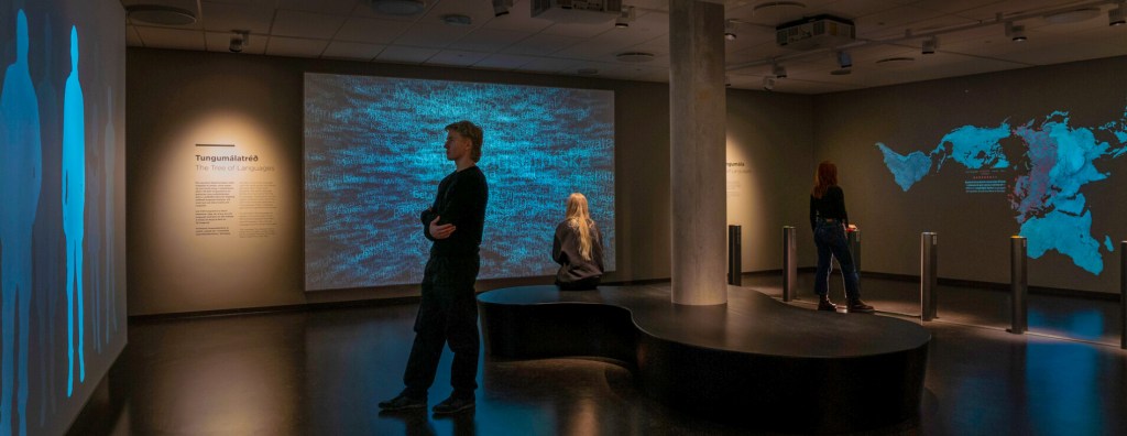 René soovitusel külastasime ka loovagentuuri Gagarin disainerite loodud interaktiivset näitust „Elav keelelabor“ („The Living Language Lab“) Islandi ülikooli filoloogia osakonnas, kus interaktsiooni-disainer Nils Wiberg tutvustas meile näituse sisu ja publikut kaasavaid elemente. Kasutusele on võetud nii infopilve projektsioonid ja liikumisanduripõhised videoteosed kui ka lihtsamad nupud ja hiired, millega osaleja seinale kuvataval kaardil orienteeruda saab. Agentuur Gagarin on disaininud näituse- ja interaktsioonilahendusi üle maailma ning on seotud ka Eesti muuseumimaastikuga – nimelt võitis nende disain Loodusmuuseumi uue väljapaneku konkursil teise koha.