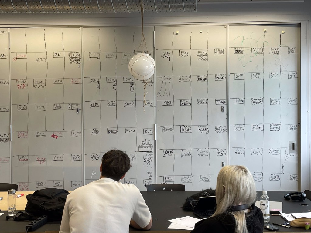 Berit: Ma arvan, et hästi oluline oli see, et Kumu soovis, et logo teeksid 20-aastased tudengid – et selles oleks mingi nooruslikkus, noortelt noortele. Sellest lähtuvalt oli ka meie mõtteprotsess selline, et me oleme 20-aastased ja me ei tahaks „kastis olla“: me kaotasime selle varem logo raamistanud kasti sõna otseses mõttes ära.